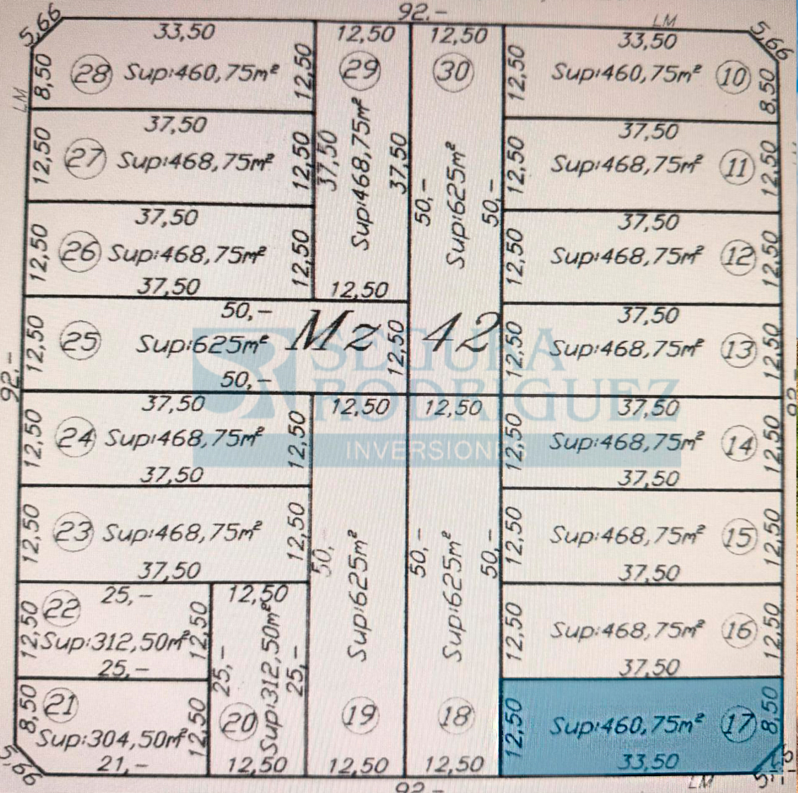 ▶️ Lote de 12,50 metros de frente por 33,50 metros de fondo, menos ochava (460,75 M²).