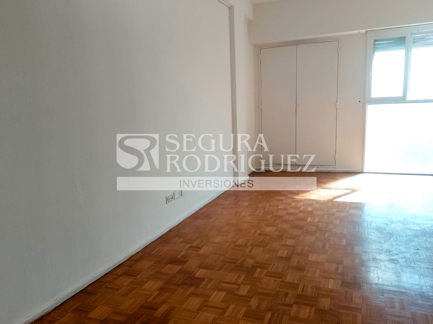 Ambiente luminoso con pisos de parquet y ventanal con vista abierta.
